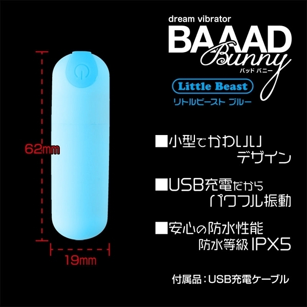 女性の好みを追求し誕生したバッドバニー・シリーズ。リトルビーストはかわいくパワフルなローターです。女性の好きなカラーで展開し持っているだけで満足できるデザインに仕上げました。またソフトな肌触りと10種類(3段階の強弱と7パターンの振動)の振動を装備し機能面でも充実しています。●カラー:ブルー