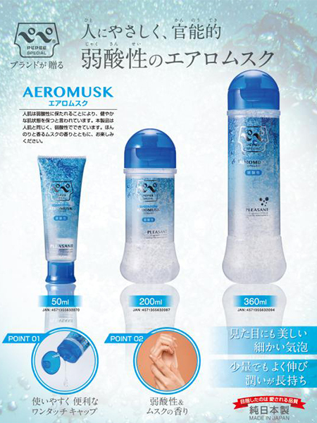 人肌と同じ弱酸性なのでお肌に敏感な人でも安心して使える「ペペスペシャル エアロムスク (200ml)」。ほんのりと優しく香るムスクの香りが官能的で、しっかりとした粘度と相まってエッチな気分を盛り上げます♪ローションには細かな気泡が入っていて軽いテクスチャーと滑りが心地よく、便利なワンタッチキャップを採用しているので使いやすさも抜群です!気分を盛り上げたいときにもどうぞ。