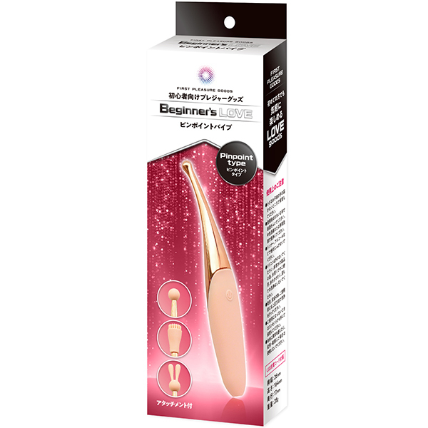 実際の商品は2〜3cm程サイズ前後します。〜初めての方に優しく愛を込めて〜初心者(入門者)に特化したをBeginner’s Loveシリーズが新発売スタンダードなピンポイントバイブの入門商品です。<ピンポイントバイブ>・クリト〇スや乳〇等を集中的に刺激可能・シンプルなワンボタン式で面倒な操作は不要・3種のアタッチメント付きで様々なシーンで楽しめる・振動パターンもオーソドックスな5種類を実装・バイブ初心者でも挿入しやすい、スリム設計ボディ■使用方法@同封のUSBケーブルを本体の下部にしっかりと差し込み充電します。Aボタンスイッチの長押しで、電源オンになります。Bボタンスイッチを押すごとに、バイブレーションのパターンが変わります。Cボタンスイッチの長押しで、電源がオフになります。Dご使用後は乾いた布でやさしく拭き、乾燥させてください。