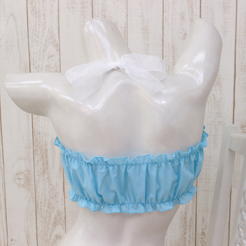 ふわふわ可愛い♪乙女チックなチューブタイプのブラジャー。●鮮やかパステルブルー×ホワイト●上下にたっぷりフリルギャザー●胸の真ん中に繊細なリボン付き●すっぽりかぶるだけの簡単装着●首元は可愛いレースリボン。ホルターネックデザインの可愛いブラが誕生!鮮やかなブルーに透け感たっぷりのレースリボンが乙女度をグンとUPさせてくれる女性用ランジェリーです。お揃いのショーツ(cm0998)もあわせてどうぞ。※水洗い不可、塩素系漂白剤による漂白不可、アイロンは中温で当て布使用、ドライクリーニング可。※こちらの商品は在庫の状況によりお届けまでに4日〜7日程度かかる場合がございます。