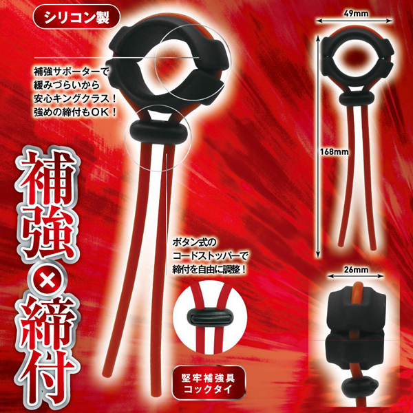 根本を締めてメンズキングに!快感キングクラスのコックタイ、「締王」!根本に巻きつけて、ネクタイのようキュッと締めれば、まるで王者のような貫禄に大変身!締め付け部分のコードストッパーは、自由に調整できるボタン式!本体素材は、肌触りがよいシリコン製!締め付ければ、もう貴男はまさにメンズキング!タイプ「X」は、「XENO」の「X」!外部サポーターを組み込んだ、紐だけでない補強具付きのコックタイです。上下に分かれた補強サポーターで、サオをガッチリ固く挟み締め!動いても緩まない、高い堅牢性も特徴です。強力サポーターで、ガッチリ補強に大変身!